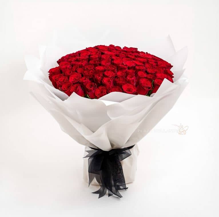 Our skilled florists have carefully arranged these resplendent roses in a delicate, pristine white plastic wrap, adding a touch of purity and sophistication to the ensemble. The white wrap provides a striking contrast to the intense red of the roses, creating a visual harmony that’s both enchanting and elegant.