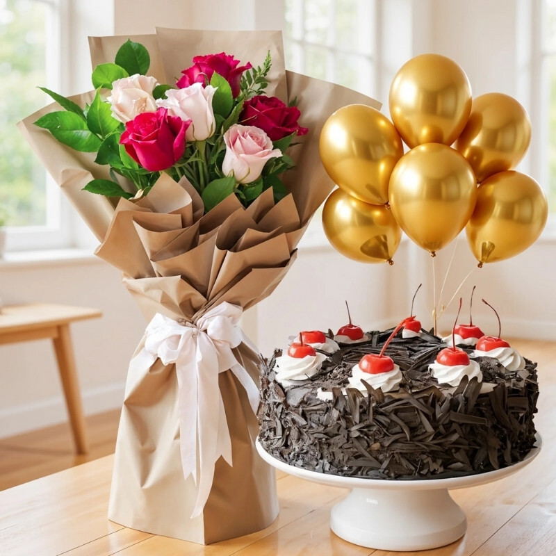Make any occasion extra special with this delightful combo featuring a bouquet of 6 red and pink roses, beautifully accented with green fillers and wrapped in elegant paper. Paired with a rich 1 kg Black Forest cake and a festive golden latex balloon, this gift brings together love, sweetness, and celebration in one perfect package.