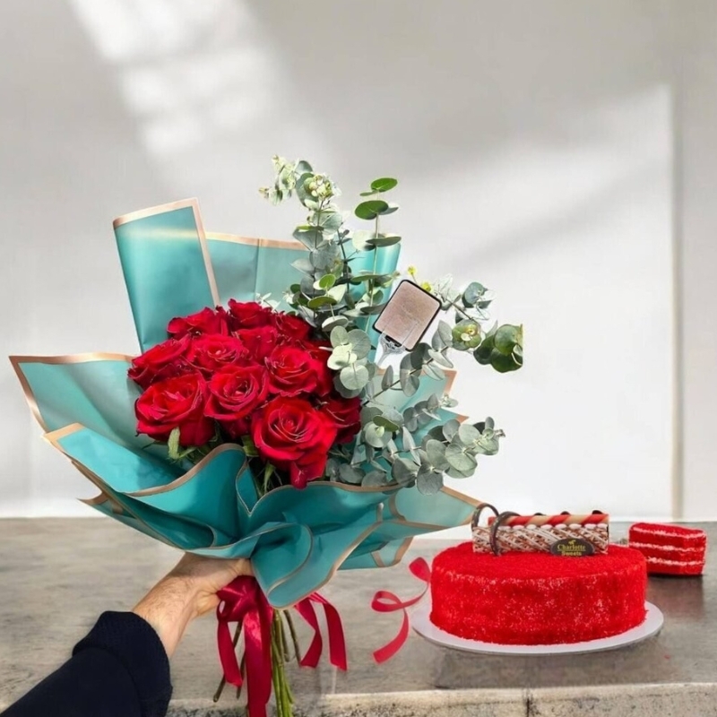 Celebrate Love and Indulge Your Senses with Our Exquisite Red Velvet Cake (6 portions) and Rose Bouquet Gift Set. This stunning gift set is the perfect way to express your love and appreciation. It features a decadent red velvet cake, renowned for its rich, moist texture and velvety smooth frosting. The cake is paired with a breathtaking bouquet of a dozen long-stemmed red roses, symbolizing love, passion, and beauty. Order now from Charlotte Sweets for delivery in Dubai, Sharjah, and Ajman! This stunning Flowers and Cake Combo is ideal for birthdays, anniversaries, or any special occasion.