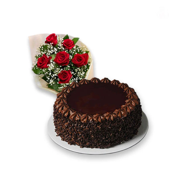 “Choco Cake Combo” with a bouquet of 6 red roses typically includes a combination of delicious chocolate cake and a beautiful bouquet of red roses. This can make for a wonderful gift for various occasions, including birthdays, and anniversaries, or to express your love and appreciation.
