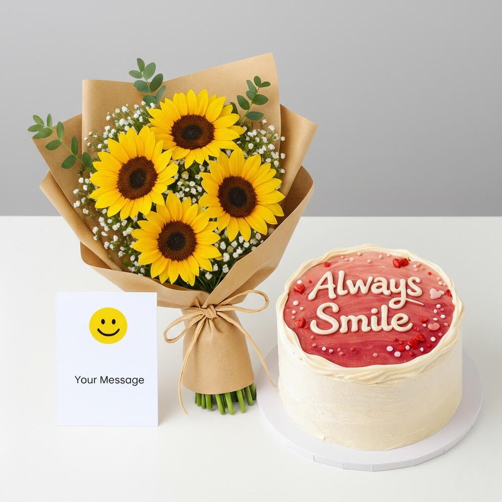 Sunflower – 4 pcs Gypsophila – 5 pcs postcard – 1 pcs cake – 1000 g