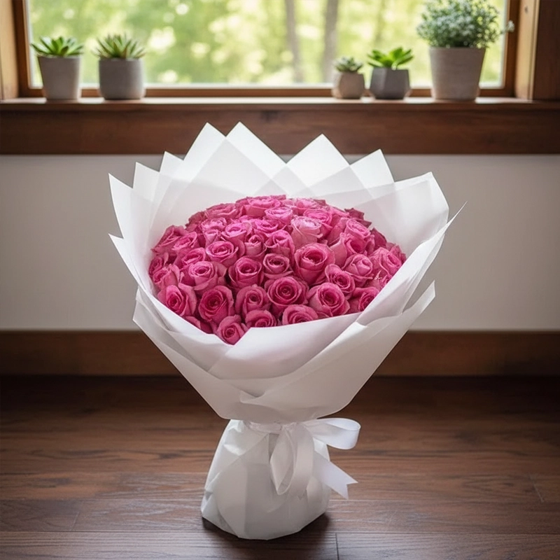The roses are expertly hand-tied into a dense, symmetrical dome and wrapped in modern, multi-layered white paper, finished with a matching white ribbon. Quantity 50 pink roses