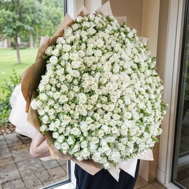 This stunning bouquet features a breathtaking combination of 100 white spray roses and 100 white roses, carefully arranged with delicate green fillers. Wrapped in elegant paper packing and tied with graceful ribbons, this bouquet exudes timeless beauty and sophistication, making it the perfect choice for special occasions, weddings, or as a grand romantic gesture.