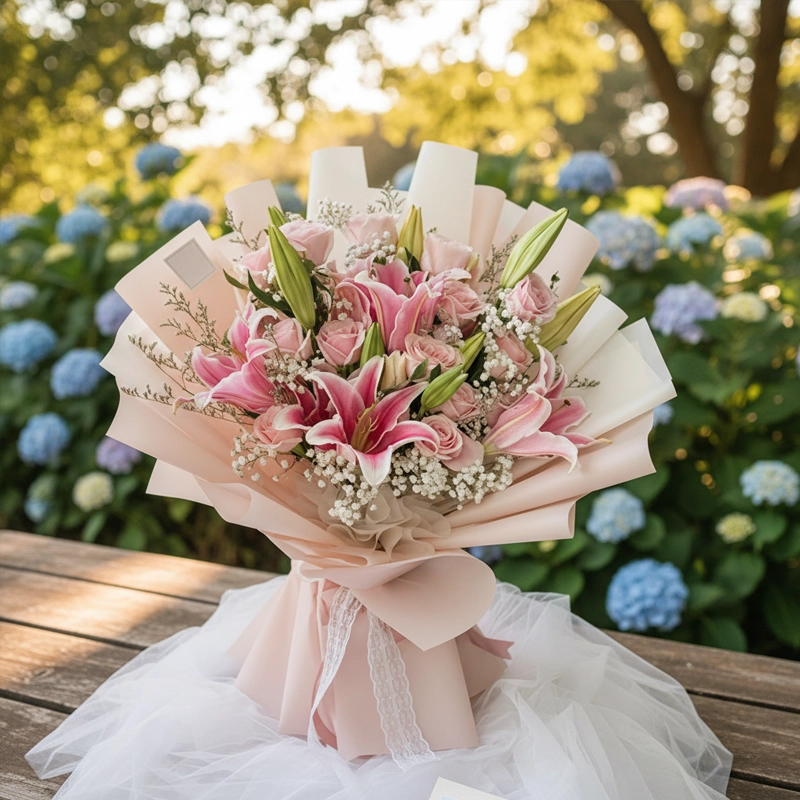 The Luxury Christmas Star Bouquet features bright white and pink roses paired with subtle greens, pastel-hued blooms, pink lilies, and fillers for an elegant and festive arrangement. If any flowers are unavailable due to season or availability, substitutions of equal or higher value within a similar color palette may be made at the designer’s discretion, ensuring your bouquet remains beautiful and fresh.