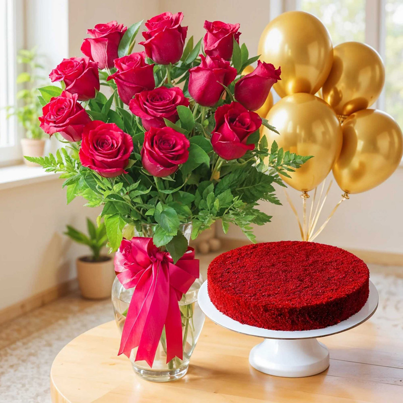 Red roses signify deep love and romance, while red velvet cake adds a touch of indulgence. The golden balloons bring a festive flair, making this combo a complete celebration of heartfelt moments.