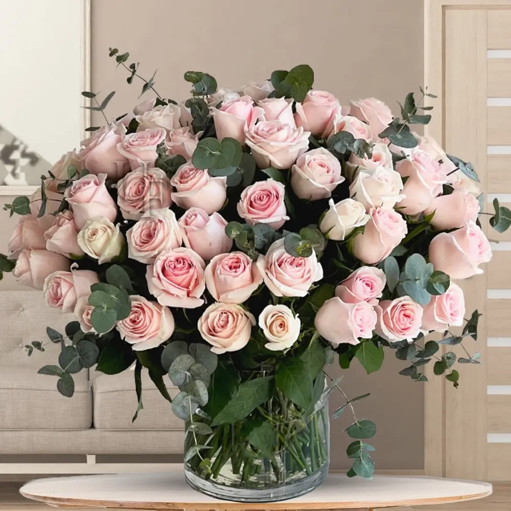 Delicate and breathtaking, this elegant arrangement features 50 pink roses, beautifully accented with fresh eucalyptus leaves, all arranged in a classic glass vase. This luxurious bouquet is perfect for making a lasting impression of grace, beauty, and love.